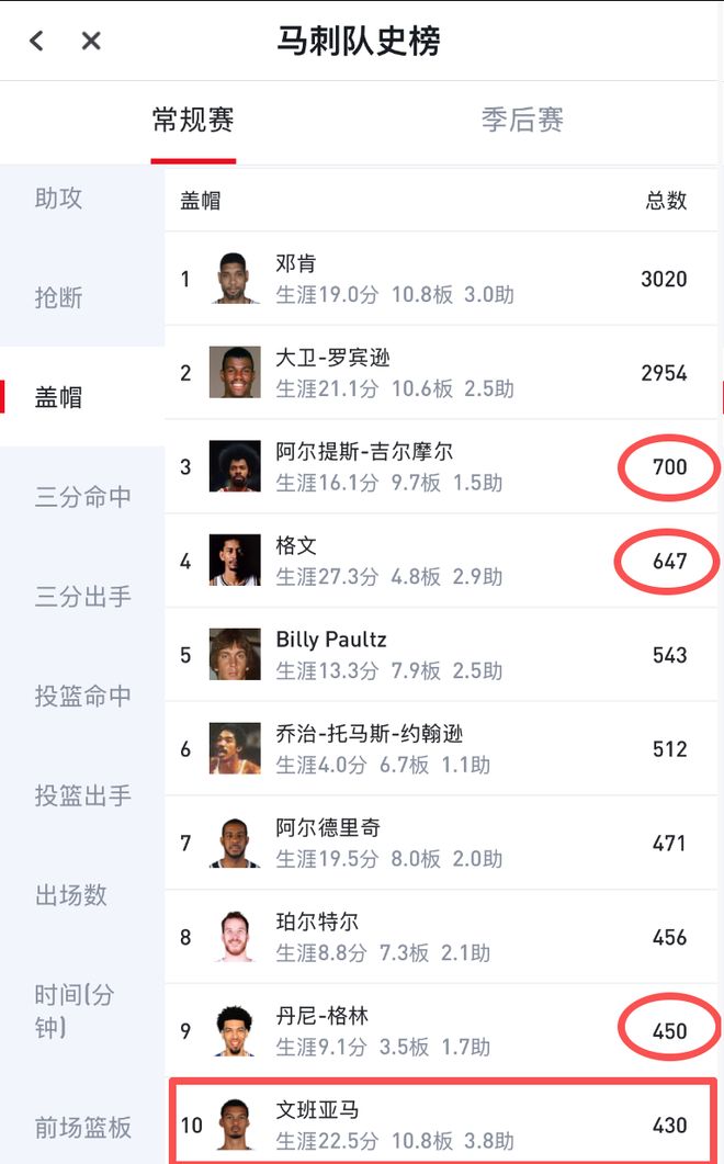 按照文班亚马生涯至今场均3.7个盖帽来推算,如果他本赛季出战达到有资格参与常规赛奖项评选的65场,那么预计新赛季文班亚马能送出240个(240.5,0.5不计)盖帽,生涯总盖帽数将来到658个(240-12+430=658),直接超越珀尔特尔、阿尔德里奇、乔治-格文等前辈,跻身队史前4。